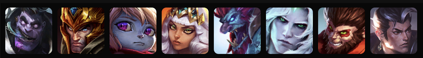 Dr. Mundo, Jarvan IV, Poppy, Qiyana, Trundle, Viego, Wukong, Xin Zhao