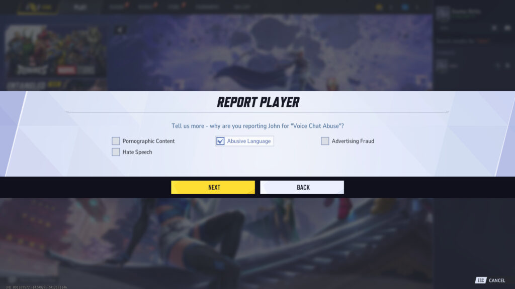 - Select a reason for the reporting: Inappropriate Nickname, Throwing, Text Chat Abuse, Cheating, Voice Chat Abuse, or Inappropriate Content for Minors.