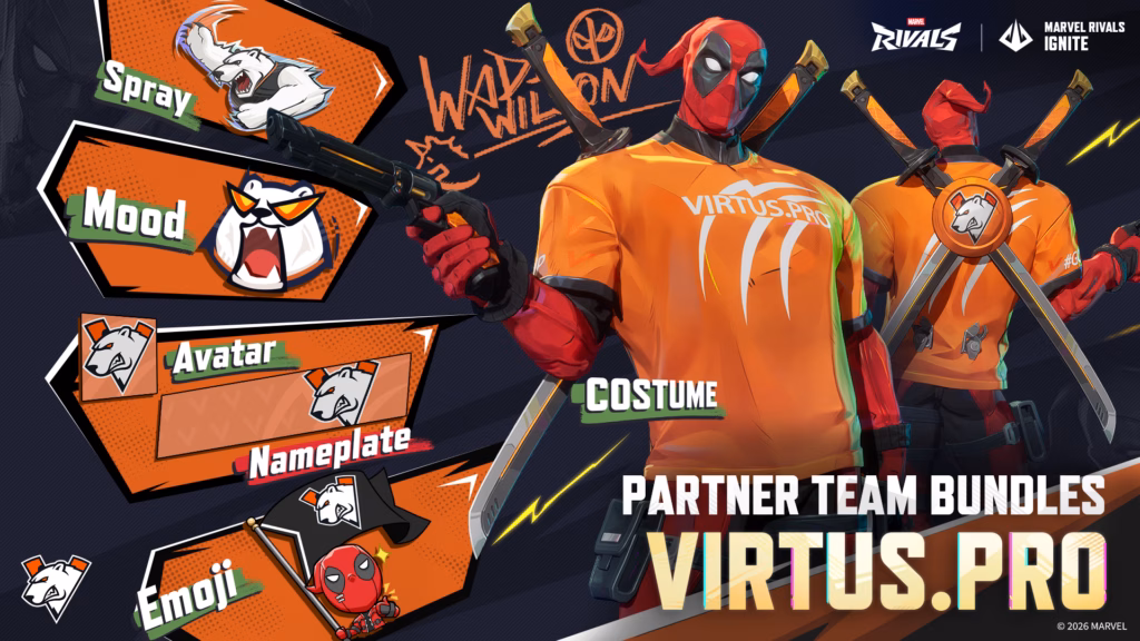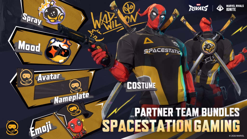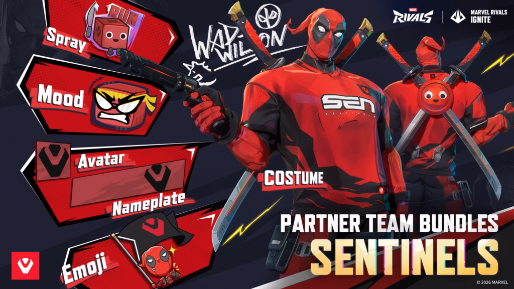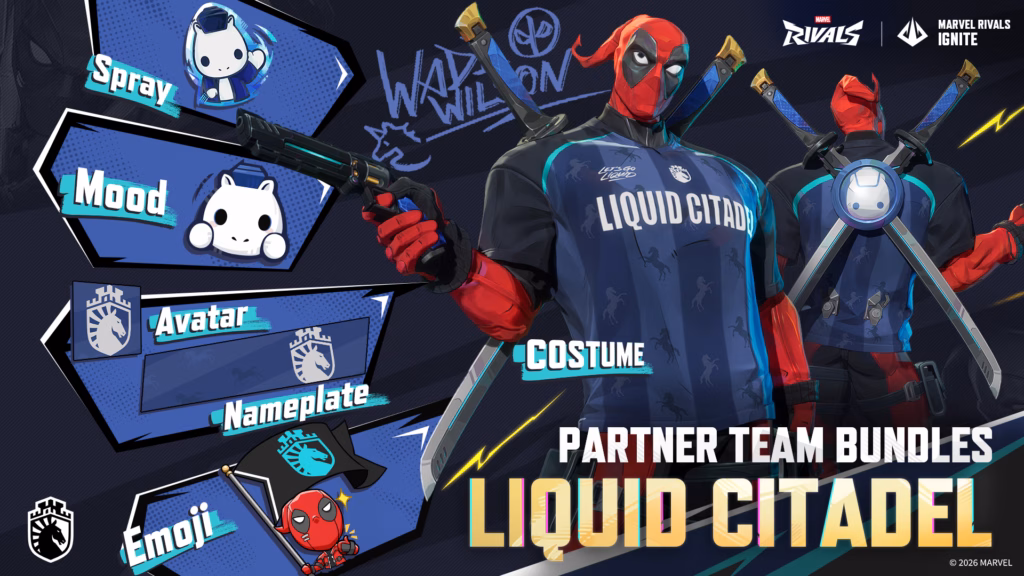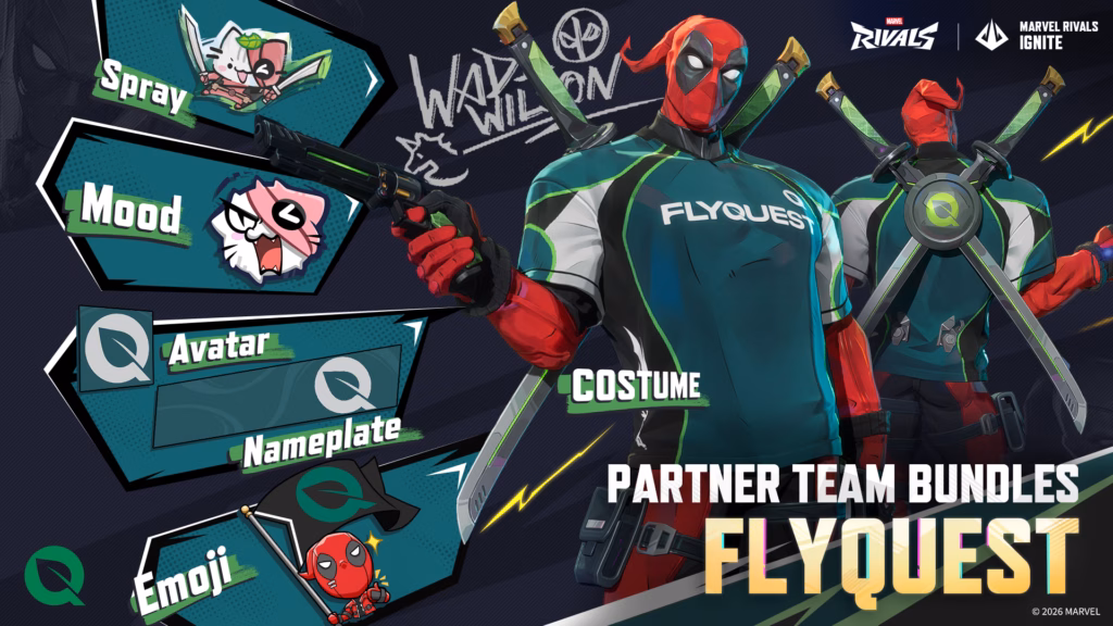 The Deadpool esports skins feature all 12 organizations in the Marvel Rivals Ignite 2026 Team Partners Program. These teams include 100 Thieves, FlyQuest, Gen.G, Liquid Citadel, Natus Vincere, NRG Shock, Reject, Sentinels, Spacestation Gaming, Team Heretics, TSM, and Virtus.pro.