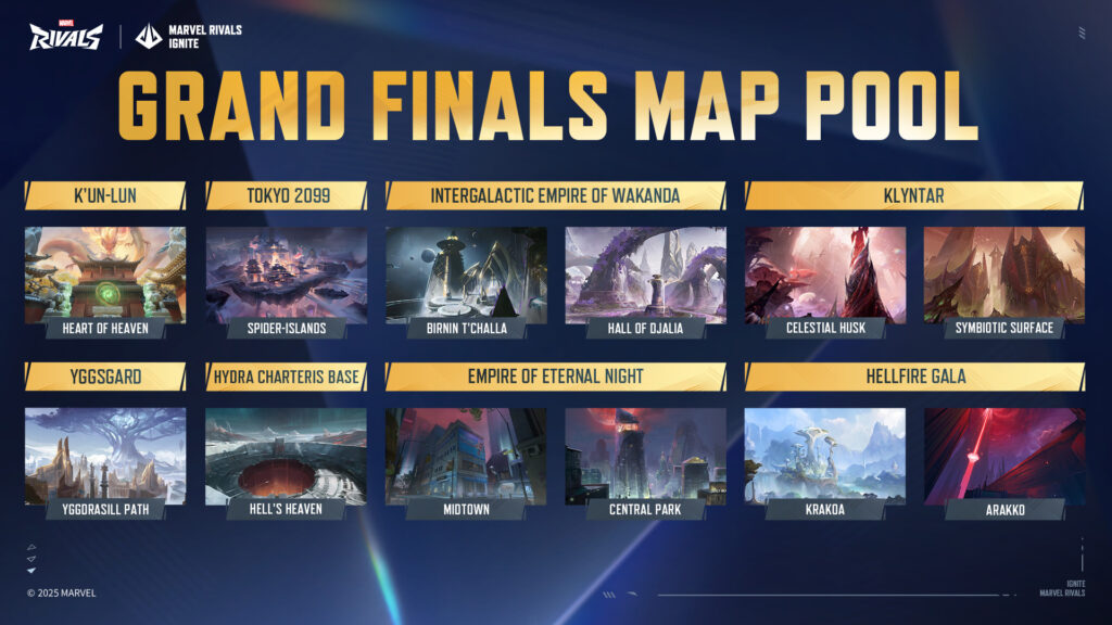 The Grand Finals event will use multiple different maps from the game, including favorites such as Spider-Islands, Birnin T’Challa and more.