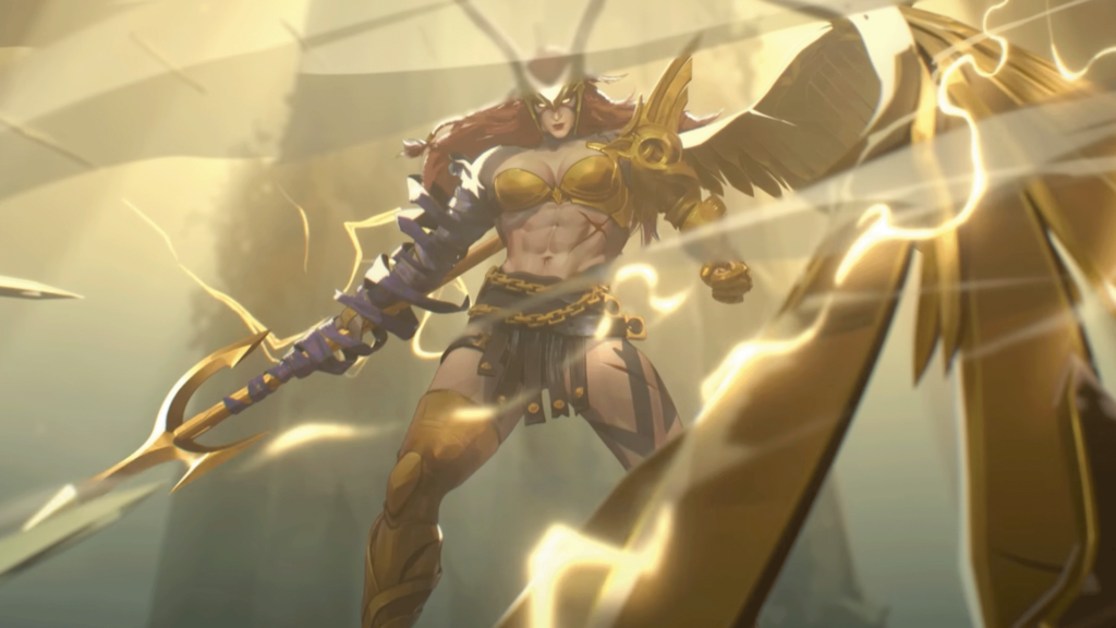 “Angela can take the fight to the skies, transforming her Ichors into a razor-sharp spear, diving into enemy lines, and opening up opportunities for her team. In times of danger, she can morph her weapon into a shield to block incoming damage. And when the moment is right, she descends from above, transforming her spear into dual axes to crush foes and protect her allies!”