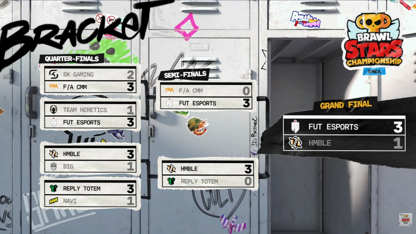 | SK Gaming 2:3 CMM 0:2 Gem Grab 1:2 Brawl Ball 2:1 Knockout 2:1 Hot Zone 1:2 Heist | CMM 0:3 FUT Esports 0:2 Bounty 1:2 Gem Grab 0:2 Brawl Ball | FUT Esports 3:1 HMBLE 1:2 Hot Zone 2:0 Bounty 2:0 Gem Grab 2:1 Brawl Ball |