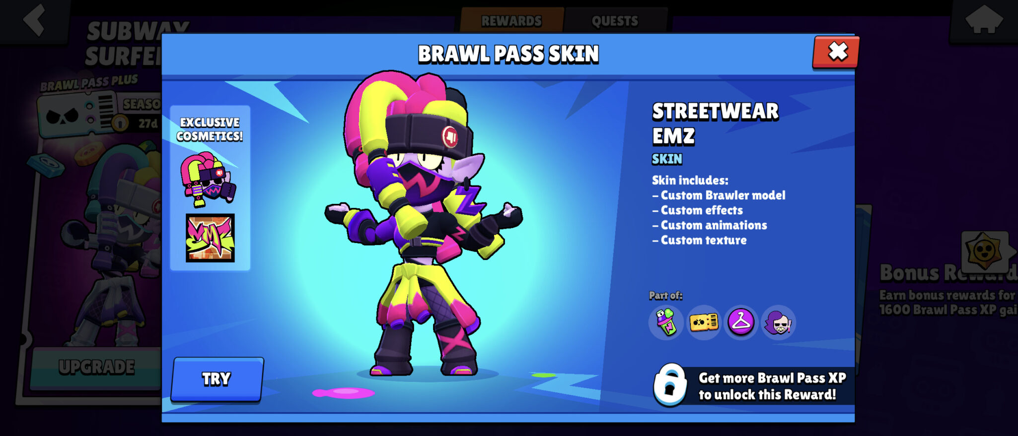 The collaboration event with Subway Surfers affects the Brawl Pass season in Brawl Stars. The main skin here is Streetwear Emz, which is inspired by the Subway Surfers aesthetics.