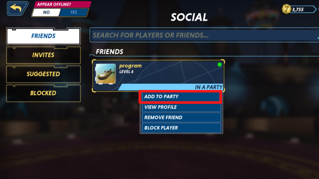 In the SOCIAL > FRIENDS tab, simply click on your friend’s account and click “ADD TO PARTY”.