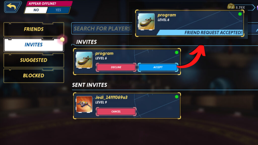 Once the friend request is sent, your friend will receive a notification in the “INVITES” tab. After your friend clicks on the “ACCEPT” button, it will show “FRIEND REQUEST ACCEPTED”. You can now see your friend in the “FRIENDS” tab and their Online/Offline status!