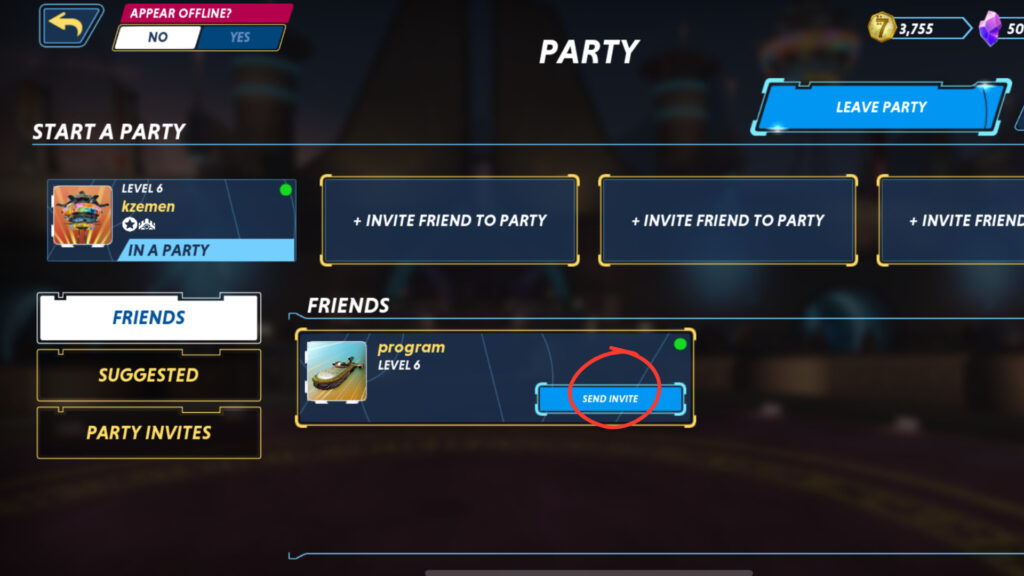 In the PARTY tab, you can directly invite your friends from your friendlist by clicking “SEND INVITE”.