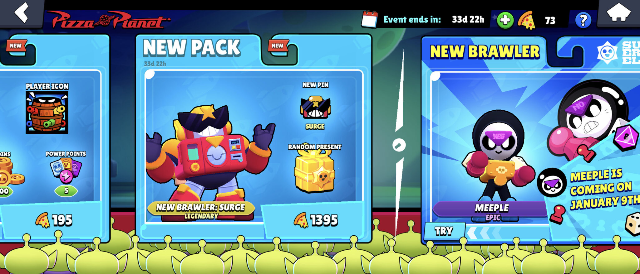 Don’t spend Pizza Slices too early! Keep this currency for Meeple. Also, you can unlock the Legendary brawler Surge here: his Lightyear skin is based on the Toy Story character Buzz Lightyear in Brawl Stars.
