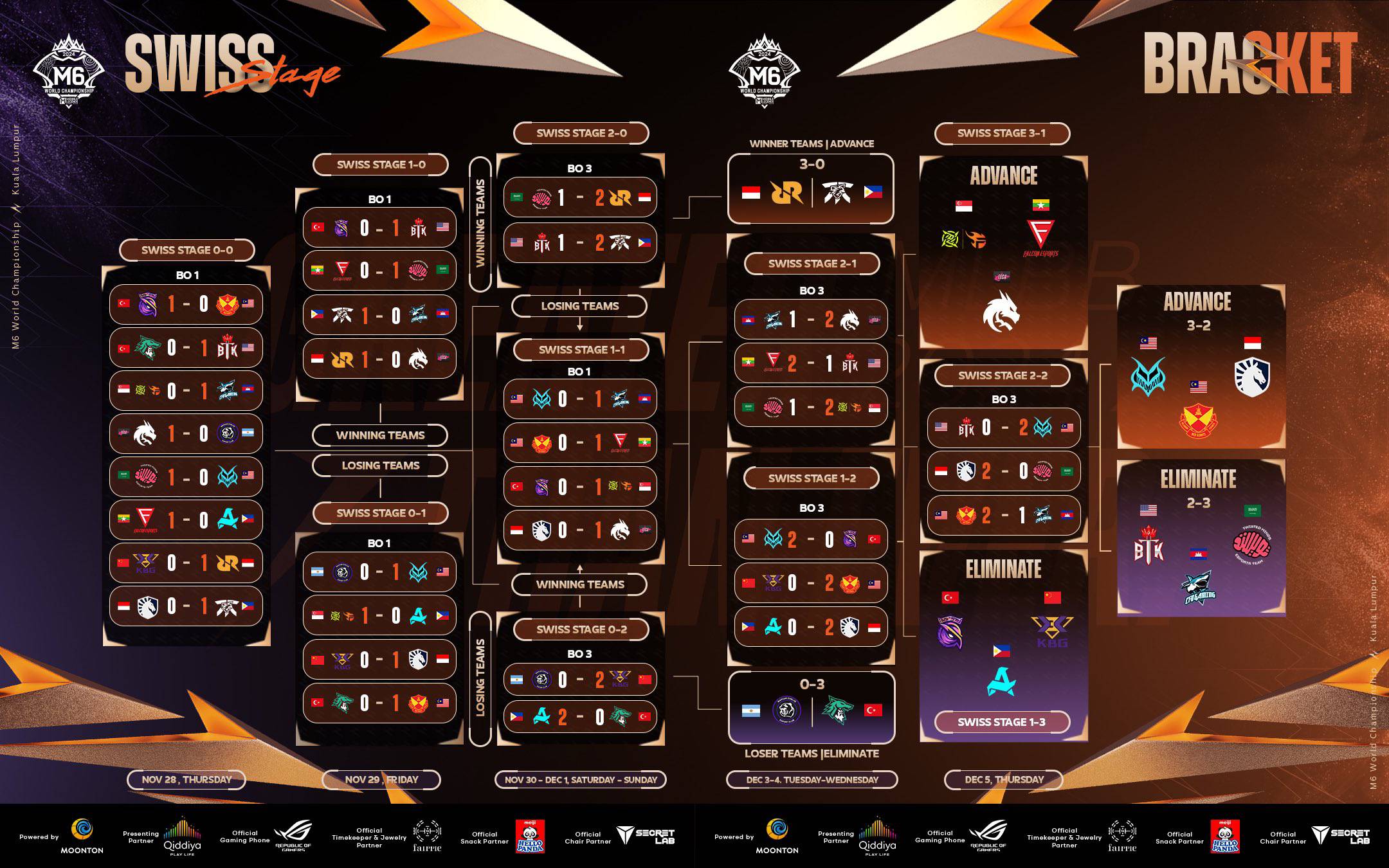 The top 8 teams advance to the next stage of the M6 World Championship: final playoffs. Here are all MLBB teams at this event, along with their Swiss stage results and standings.