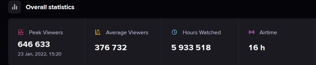 With such a large average viewership record and high peaks, this event had nearly 6 million hours watched. This number is huge considering the event was only live for 16 hours compared to the hundreds that some of the bigger events run for.