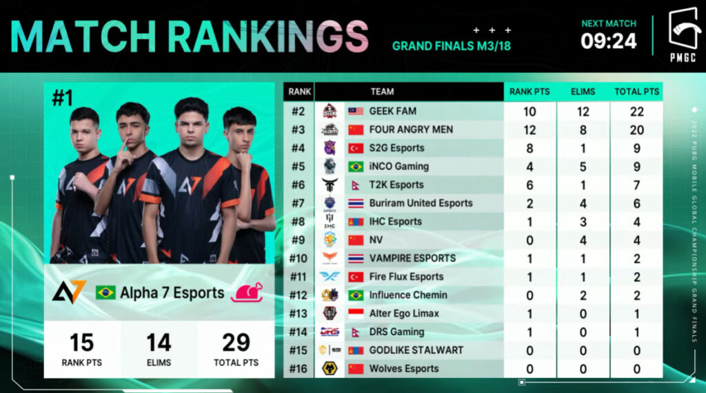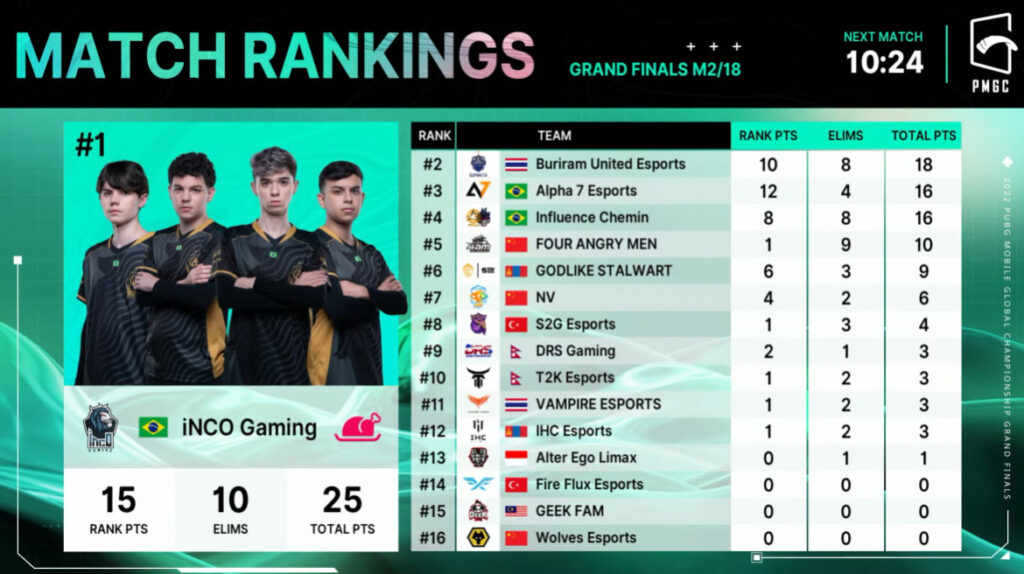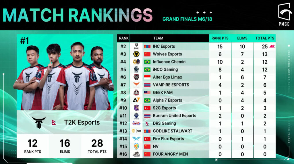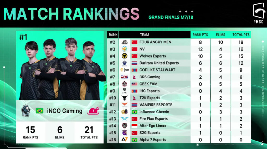 The PMGC 2022 Grand Finals featured a total of 16 teams from around the world. They competed across 18 matches (three per day) to determine the winners. The teams are as follows: