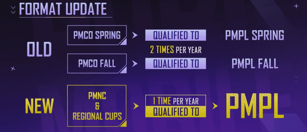 PMCO sees a significant shift with a heavier focus on the grass-roots competition. Switching to regional amateur and semi-pro competitions with PMCO South America, PMCO Europe, PMCO Middle East and PMCO Asia, PMCO now forms the gateway to the esports ecosystem. PMCO teams no longer qualify directly to PMPL but instead will have to go through the PMNC in order to reach the PMPL in 2023.