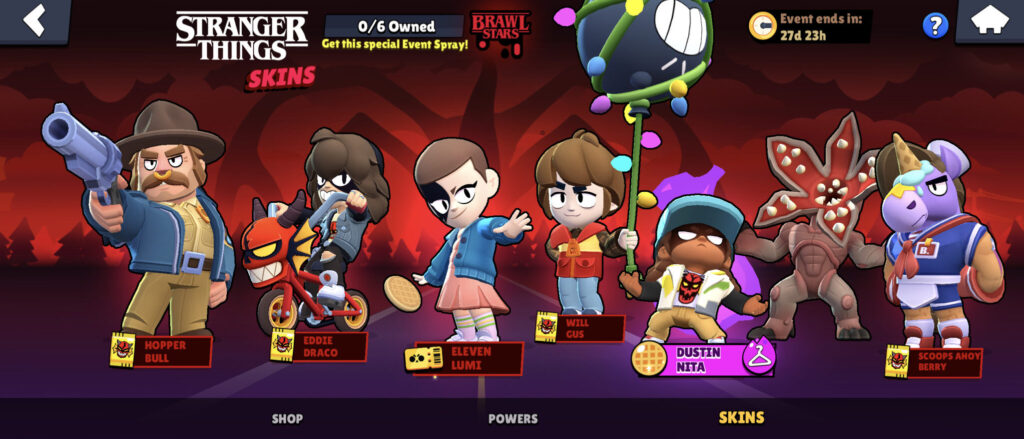 A new awesome event hits the mobile game Brawl Stars: with Stranger Things. Starting from Nov. 6 and up to Dec. 6, you can participate in a fearsome solo showdown, collect waffles as a special currency, unlock Power Cards, and receive Stranger Things skins for your brawlers.