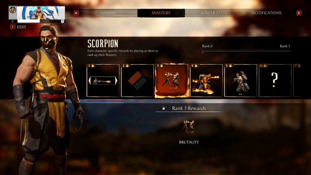 Each character in Mortal Kombat 1 has various Brutalities, but how many are in the game is unknown. To unlock these finishers, you must level up each character. You can view each character’s progress by clicking the Select button on your controller while on the main menu.