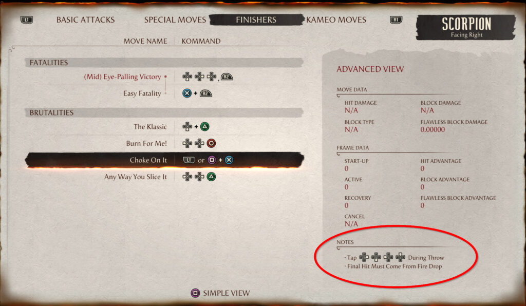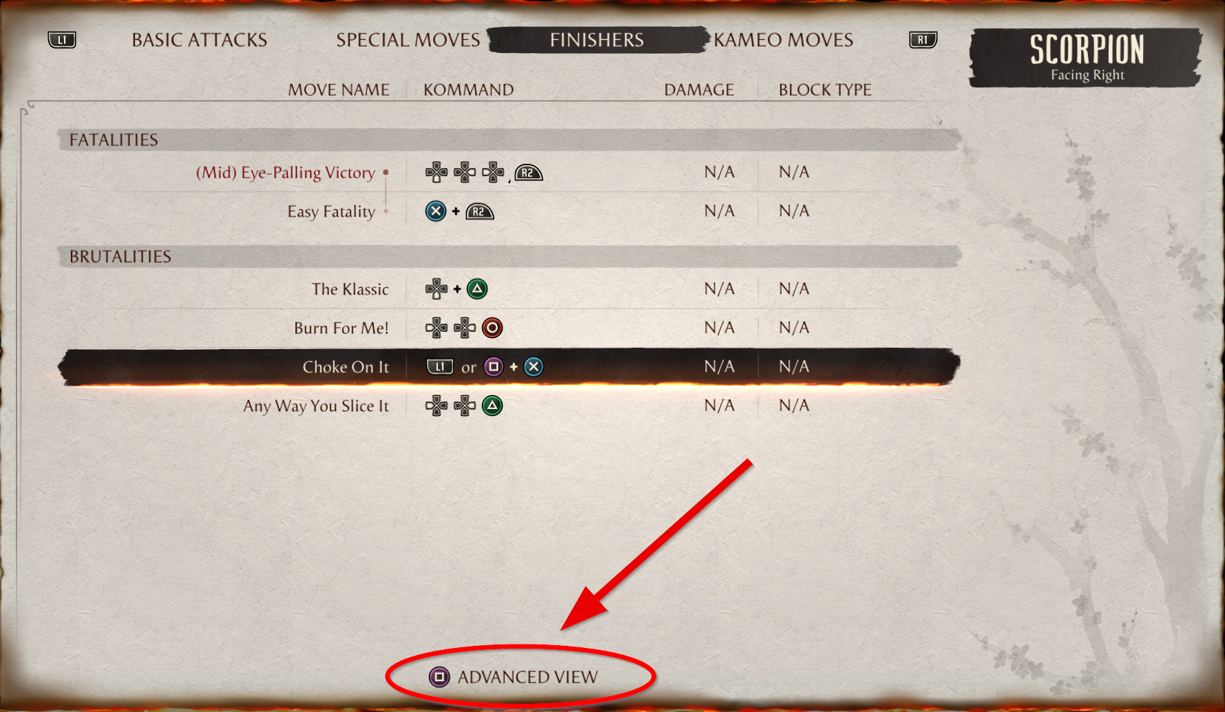 After unlocking more Brutalities, you can view them by heading to the Move List and opening the Finishers tab. To learn the precise button combination, open the Advanced View menu and observe the bottom of that screen.