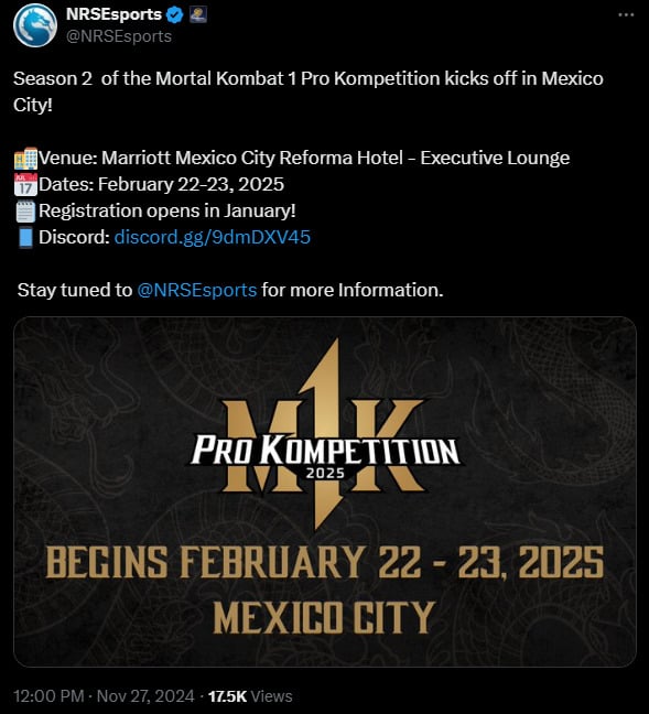On the heels of Dominique “SonicFox” McLean winning Final Kombat 2024 in June, they will be back to defend their title for MK1 Pro Kompetition Season 2. A pair of social media posts from NRSEsports say the season kicks off in Mexico City, Mexico, from Feb. 22 to 23 at the Marriott Mexico City Reforma Hotel. It’s unclear what the event will entail, but we expect more details soon.