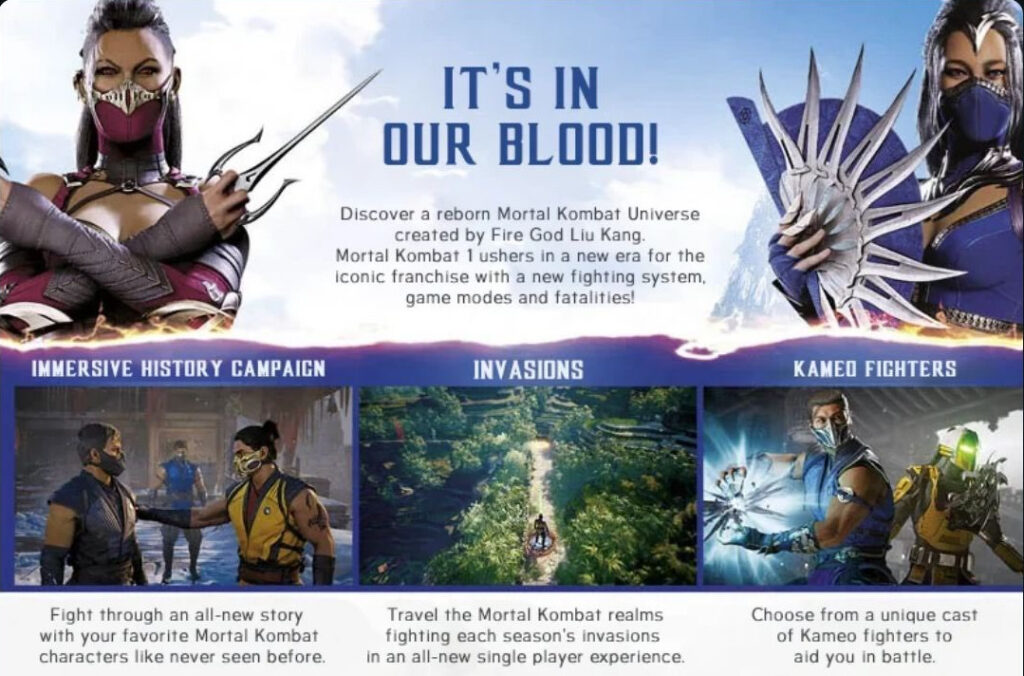 The box art provided no additional details other than the Invasions mode ahead of Mortal Kombat 1’s launch. The game will have a story mode to explain the new universe and renewed characters. Furthermore, the Kameo fighter system is briefly mentioned. Much of the primary and Kameo fighters have already been revealed, but a few are yet to be announced.