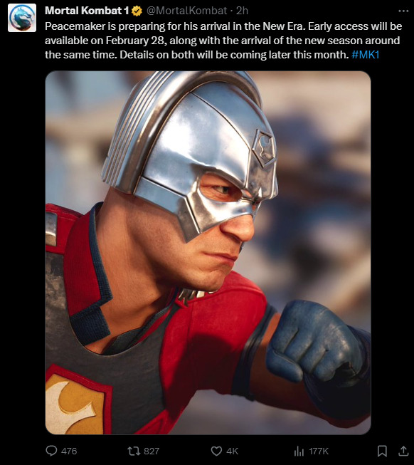 The official Mortal Kombat Twitter account announced that Peacemaker would arrive on February 28 for those who purchased the game’s Premium or Kollectors Edition, and the following week for non-early access players. Additionally, the post on X indicates the next season of Mortal Kombat 1 will launch around the same time, with Krossplay, Invasions, and more.