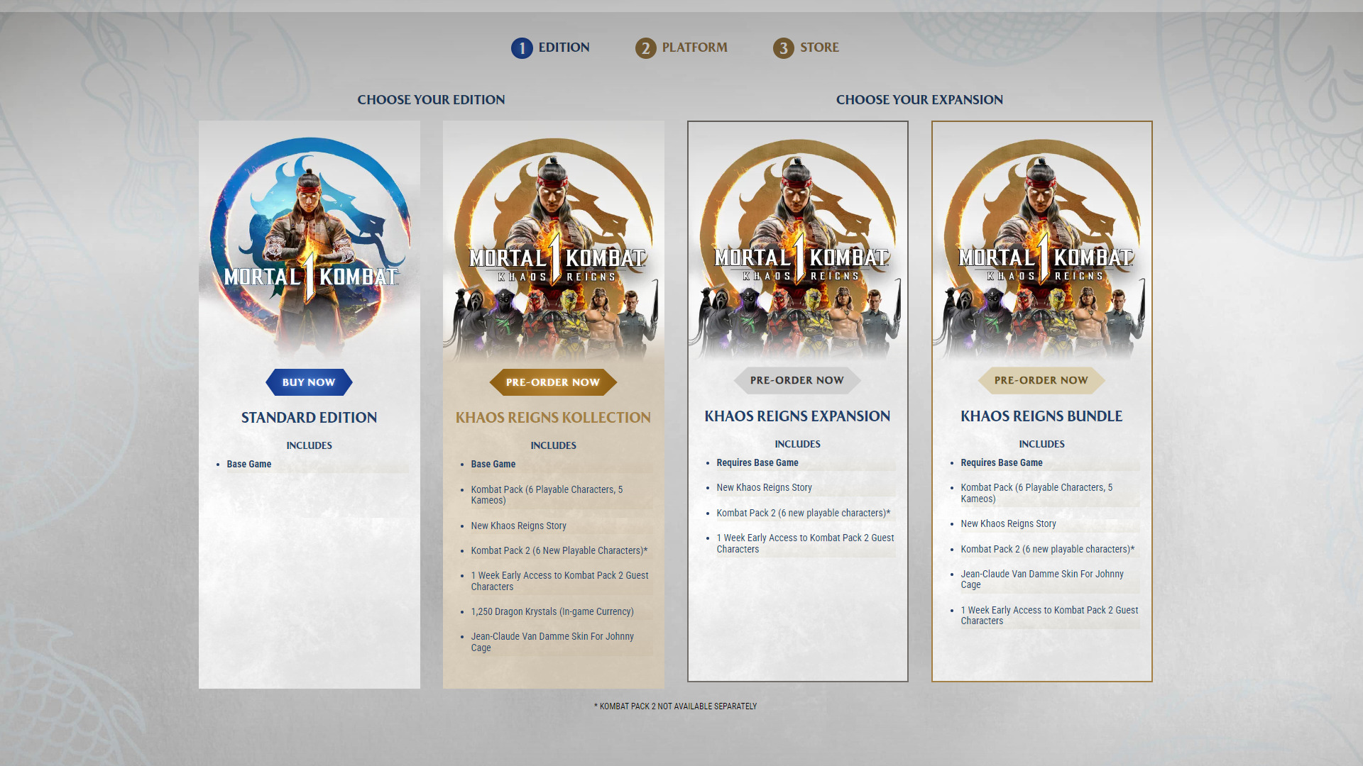 The Khaos Reigns DLC is available individually for $49.99. You can also purchase a Bundle, which includes Kombat Pack 1 and 2, or the Kollection, which consists of the entire Mortal Kombat 1 game and all DLC. Most platforms offer Khaos Reigns at a discount, so you may want to keep an eye on that.