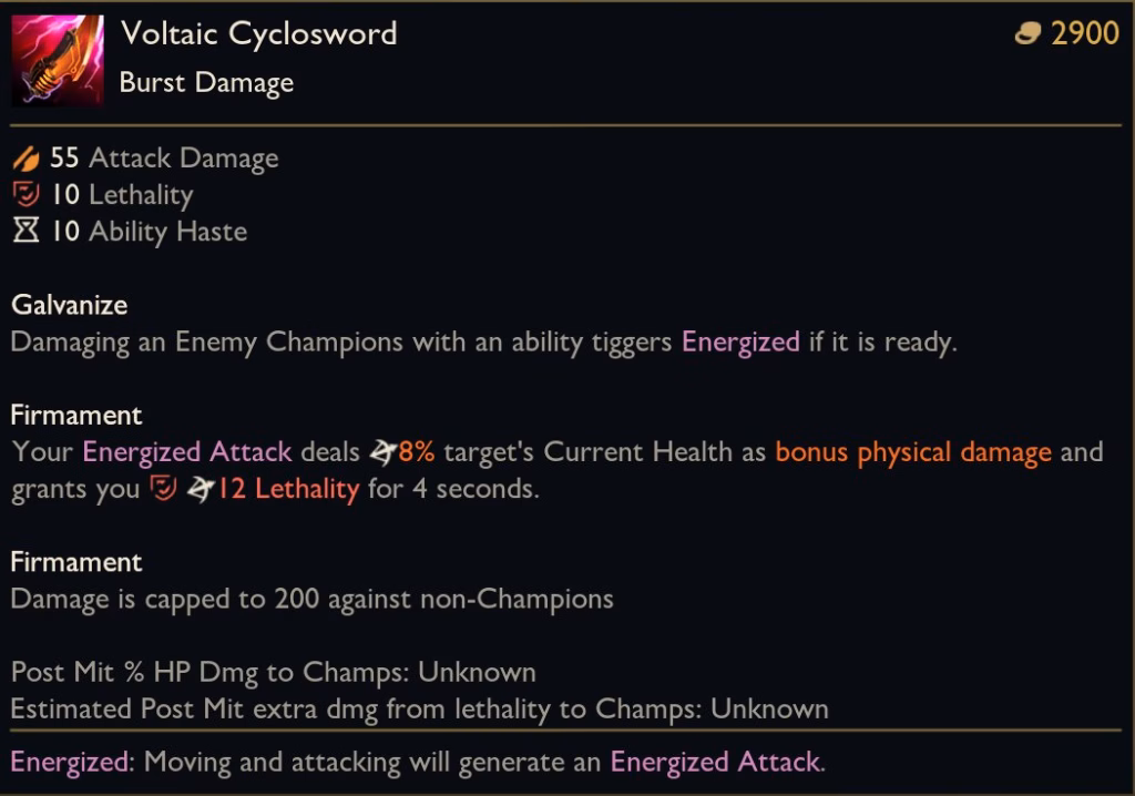 Voltaic Cyclosword is losing its synergy with dashes and blinks in favor of being able to trigger Energized off of ability damage. The slow has also been removed for more damage and Lethality.
