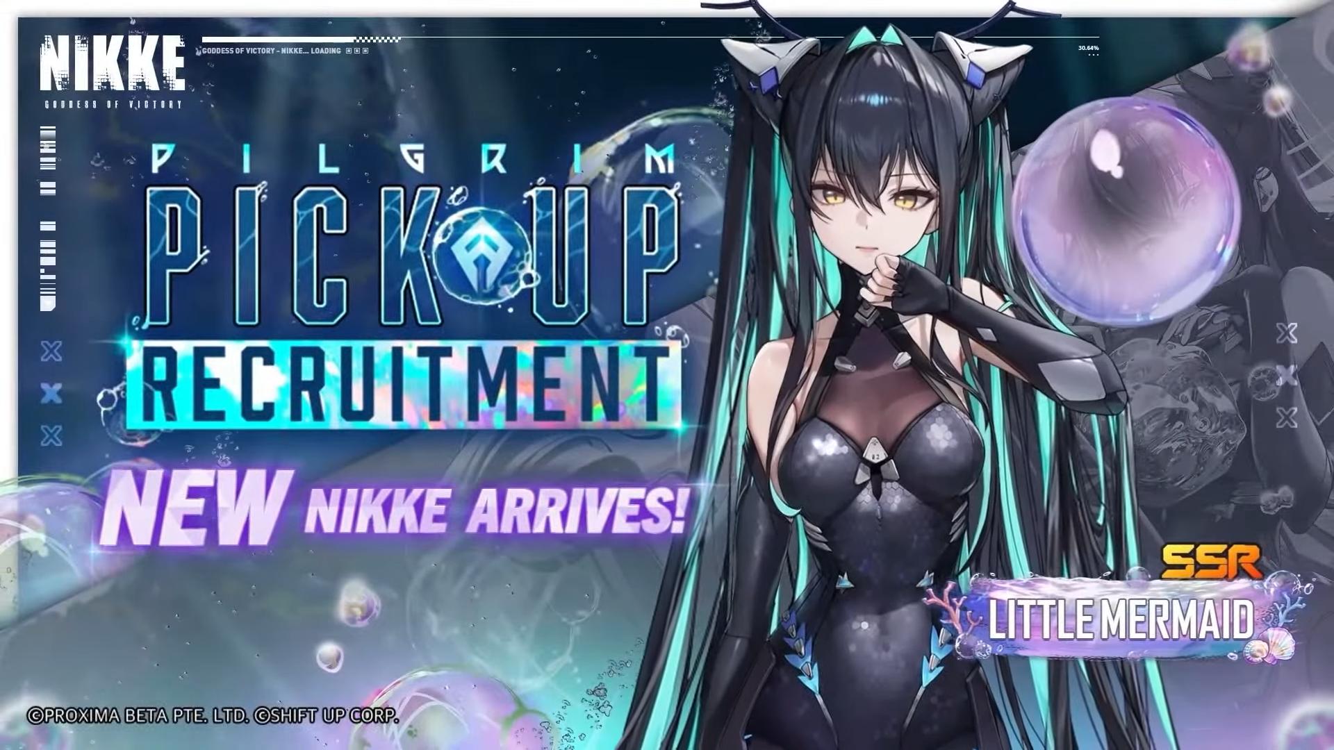 Next is the newest Pilgrim NIKKE, Little Mermaid! She is a Wind Supporter unit with Burst Skill I, and wields her SMG Spindrift to battle. She is a member of the squad Old Tales, and is also known as Siren when she appeared in a previous in-game event.