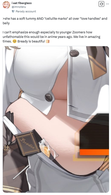 While stretch marks are a common occurrence in the real world, the addition of them to a NIKKE character design was heavily praised. Bready is the first NIKKE to have her design include stretch marks. She is also the first NIKKE to have more natural curves at the midsection, with a much fuller figure -especially around her waist – when compared to all of the other 149 characters.