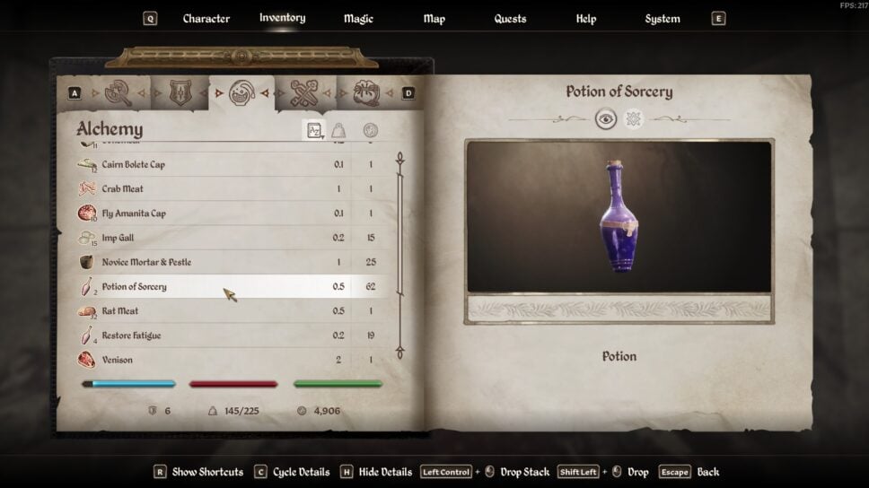 To actually craft the potion, you’ll head into your inventory. From there, click on the Mortar and Pestle we mentioned earlier. This will open the games alchemy menu. You’ll see all the ingredients you have avaliable, and can click on them to add them to the pot.
