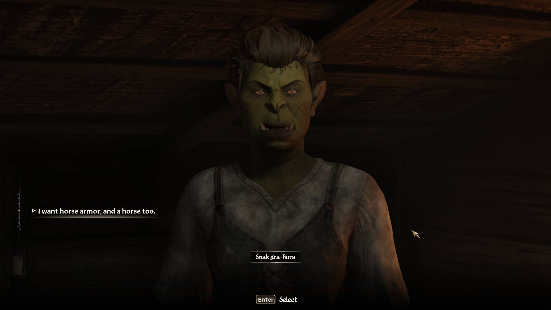 Enter the stables and initiate a conversation with Snak gra-Bura. She’ll tell you that the stables don’t sell horses anymore. If you can beg her nicely by answering that you can take any horse available, she’ll give you her old nag, a steed with terrible running speed but helpful enough to get you through any location faster.