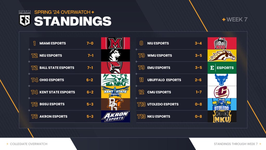 Week seven brought some amazing competition throughout the conference. Ball State falling to Northeastern marked the biggest story from the week of competition. Northeastern took over the second place mantle and made Miami the sole owner of first place. On the other side of the conference Akron, Bowling Green, Ohio, and Kent State continued to show they belong in the Top 8.