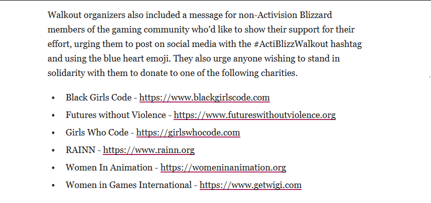 At the end of the day, the best way to support this walkout and to demand better working conditions is to spread the word via social media with the #ActiBlizzWalkout hashtag and donate to the below charities as provided by the Activision Blizzard employees to Kotaku:
