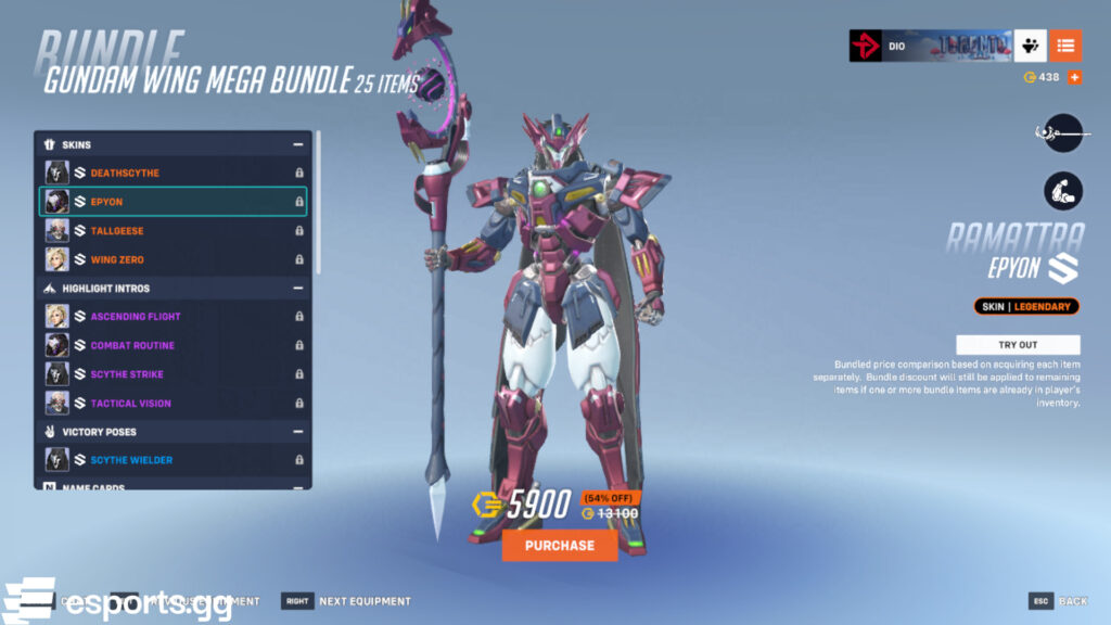 | Epyon Ramattra Skin | Get the Overwatch 2 Gundam Wing Mega Bundle for 5,900 Overwatch Coins, the Epyon Ramattra Bundle for 2,800 Overwatch Coins, or just the skin by itself in the hero gallery for 1,900 Overwatch Coins. |