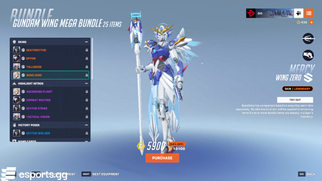 | Wing Zero Mercy Skin | Get the Overwatch 2 Gundam Wing Mega Bundle for 5,900 Overwatch Coins, the Wing Zero Mercy Bundle for 2,800 Overwatch Coins, or just the skin by itself in the hero gallery for 1,900 Overwatch Coins. |