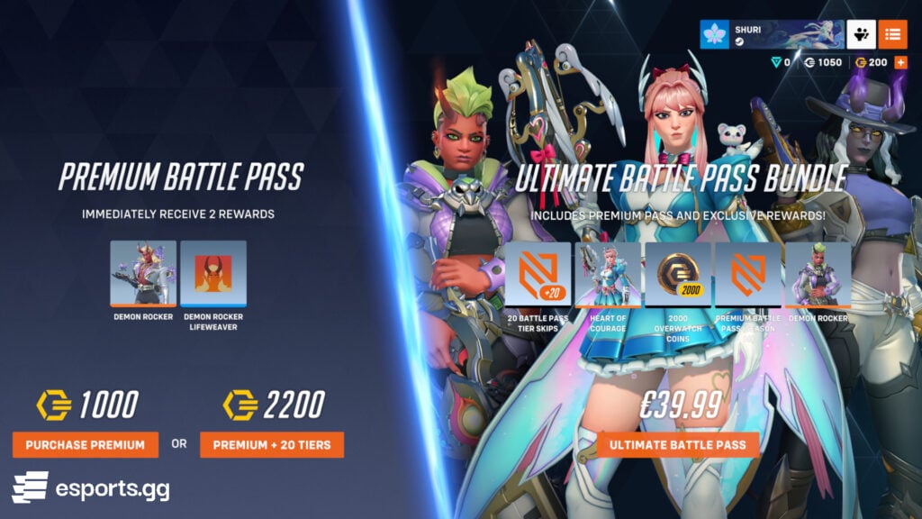 You can choose to either pay about $10 USD for the premium version or buy the Ultimate Battle Pass Bundle that includes two additional skins — Illari Demon Rocker and Freja Heart of Courage — 20 tier skips, the premium Battle Pass, and 2,000 Overwatch Coins. This is the most expensive version, requiring about $40 USD.