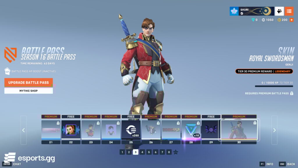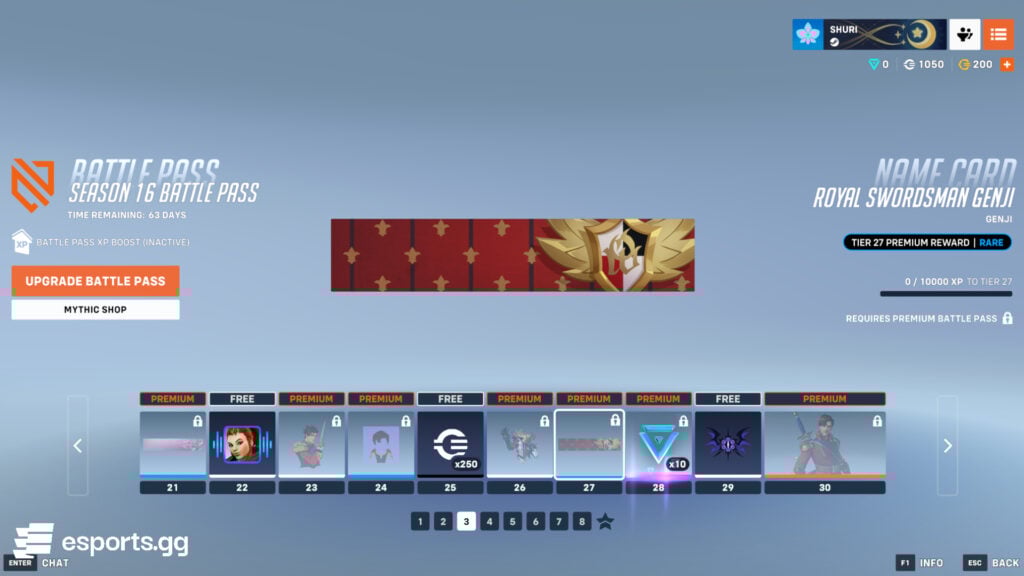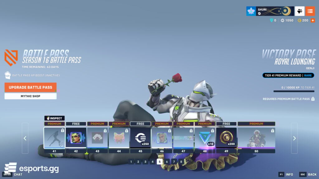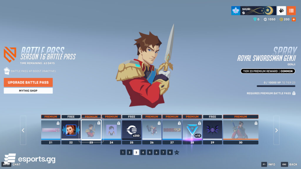 Brigitte appears again to offer you a free voice line called “Yield to my Shield.” In the same Battle Pass page, you also get 250 credits and a common Black Lotus spray. Genji is the man of these tiers with a new legendary skin called Royal Swordman Genji. He truly looks like a gentleman!