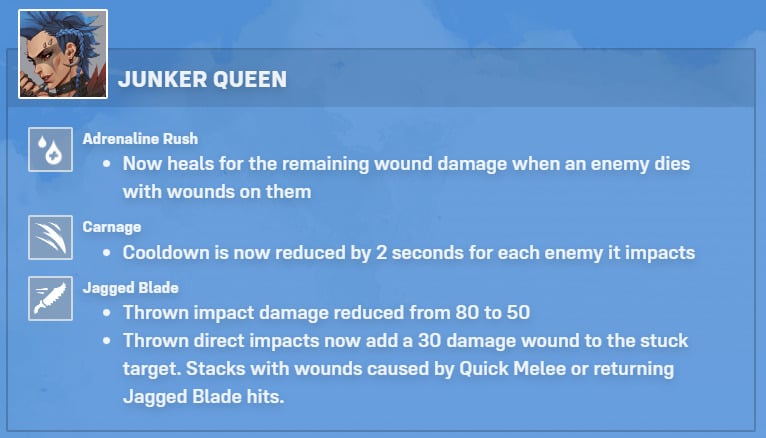 Junker Queen dominated Quick Play queues and the OWL meta upon her initial release. However, the release of Kiriko and a shift in the meta towards large amounts of burst damage made her a tanking liability. Not to say she was bad, but a lack of survivability hurt her chances at hanging in a crowded Tank field. The biggest, almost busted change has to be to Carnage. On an eight second cooldown, Queen now can swing that axe into a group and get it back in an instant. The other changes lend the tank a ton of self-sufficiency, which may make up for her ability to soak damage like Ramattra or Sigma.