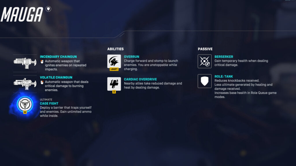 - Ultimate: Cage Fight – Traps nearby opponents in a cylindrical fighting ring that blocks enemy healing and damage from outside. Mauga also has infinite ammo for its duration.