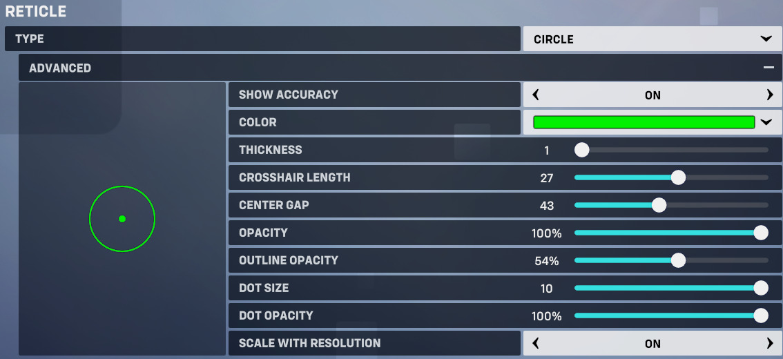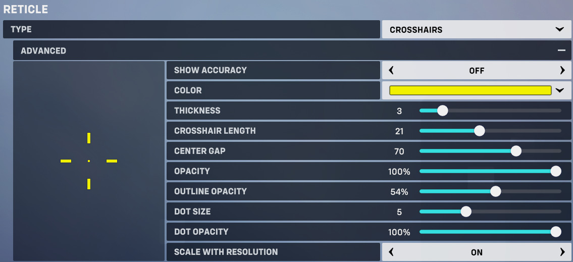 Experiment with the settings! You can even change each individual Heroes’ reticle settings on the right side of the screen by hitting the ‘Change Hero’ button. For instance: When playing Widowmaker I actually prefer using only a small, red dot. Meanwhile, when playing Ashe or Hanzo I’ve found that the full crosshair reticle helps with body shots.