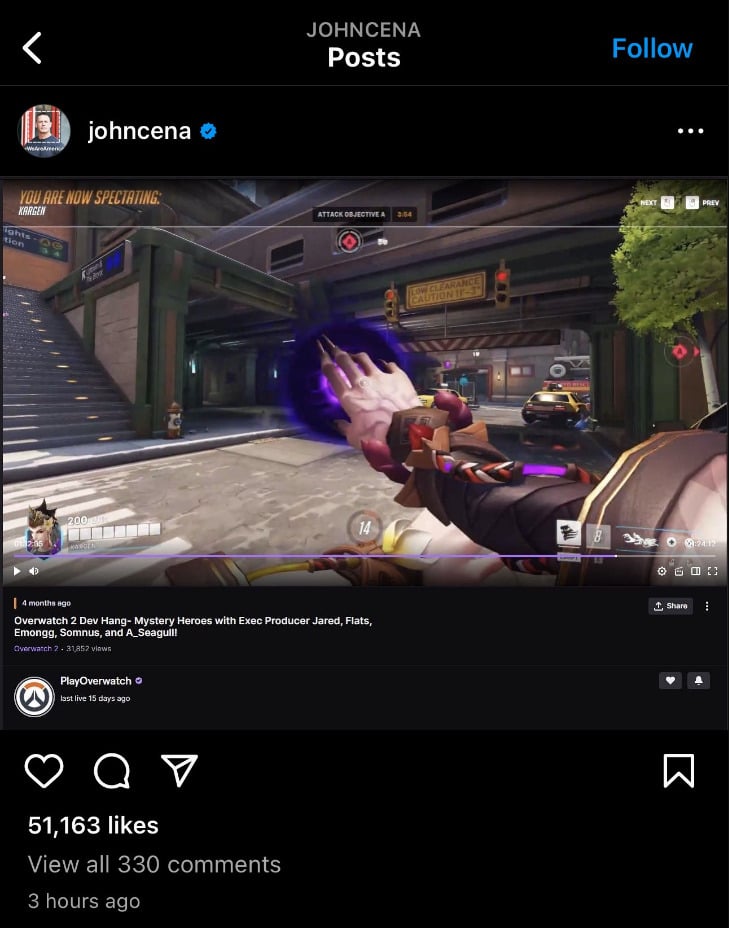 - WWE x Overwatch collaboration. Not out of the ordinary, as Cena shared a screenshot on his IG page from a recent developer livestream in which the team was talking about potential collab opportunities. Also, WWE does this kind of thing all the time, most recently seen with Rainbow Six: Siege. Give me Wrecking Ball in a John Cena hat, shirt, and jorts, please.
