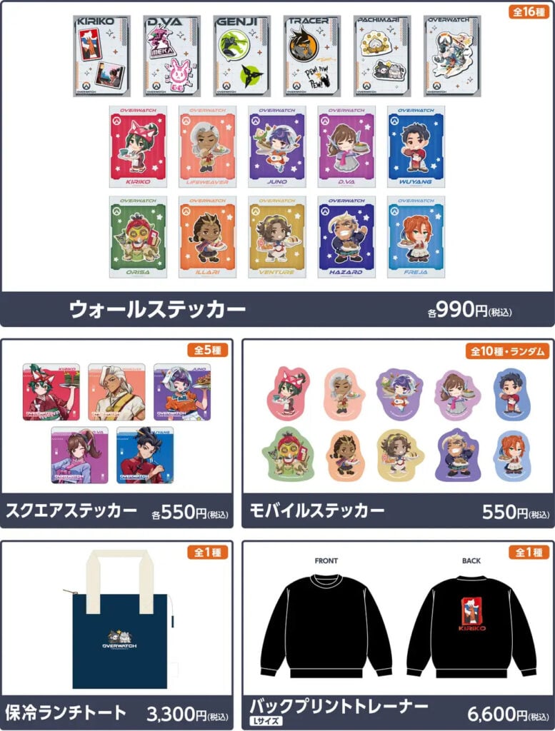 In terms of other merchandise, the cafe collaboration features standees, keychains, a door hanger, a mug, a Hanzo and Genji Pachimari tote bag, a Kiriko sweater, and stickers galore.