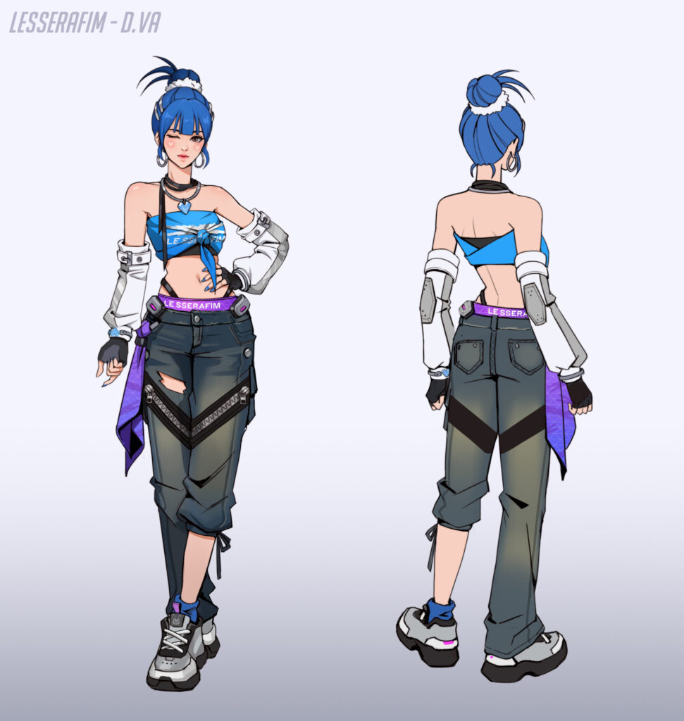 The new skin will feature a blue and purple palette, mirroring D.Va’s outfit, hair color, and clothing details. Her tank top and belt both showcase LE SSERAFIM twice. During the 2023 event, D.Va also received a skin created by Kazuha.