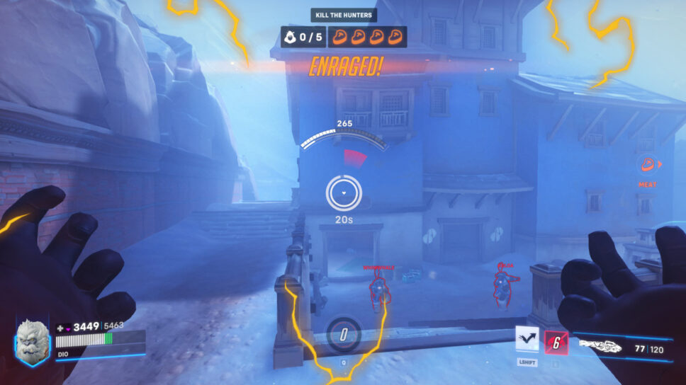 If you’re playing as Hunter Mei, then work with your teammates to predict where Yeti Winston wants to go next, track him down, and freeze him to dish out some damage. Your team’s goal is to get his health down to zero. However, if the enemy Winston happens to eat four pieces of meat, then watch out for his ultimate. You can tell how long this lasts by looking at the bar under the “Run for your Life” text in front of your screen. Above the same text is Winston’s health total.