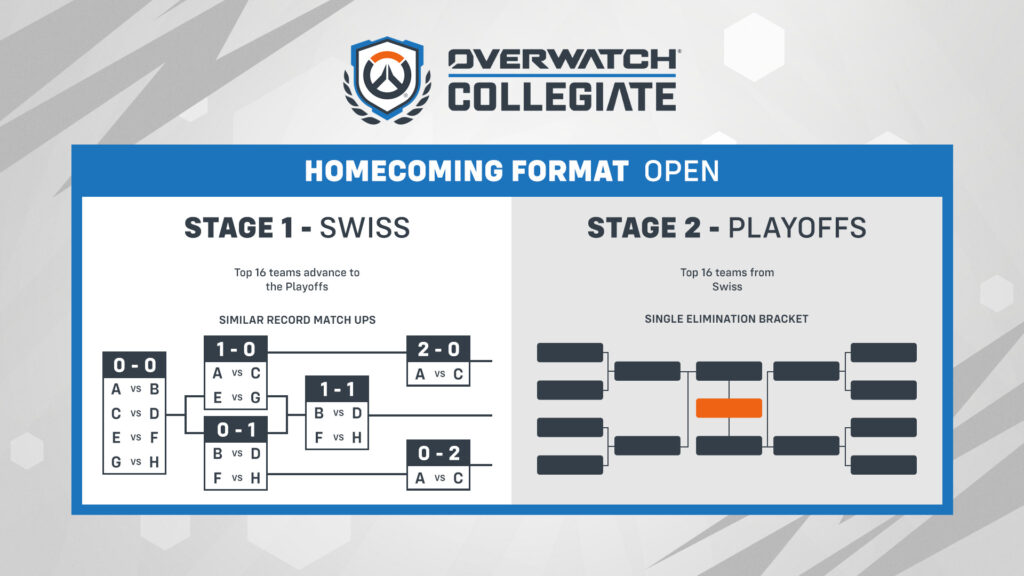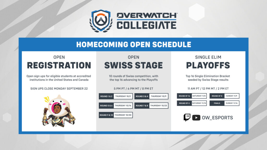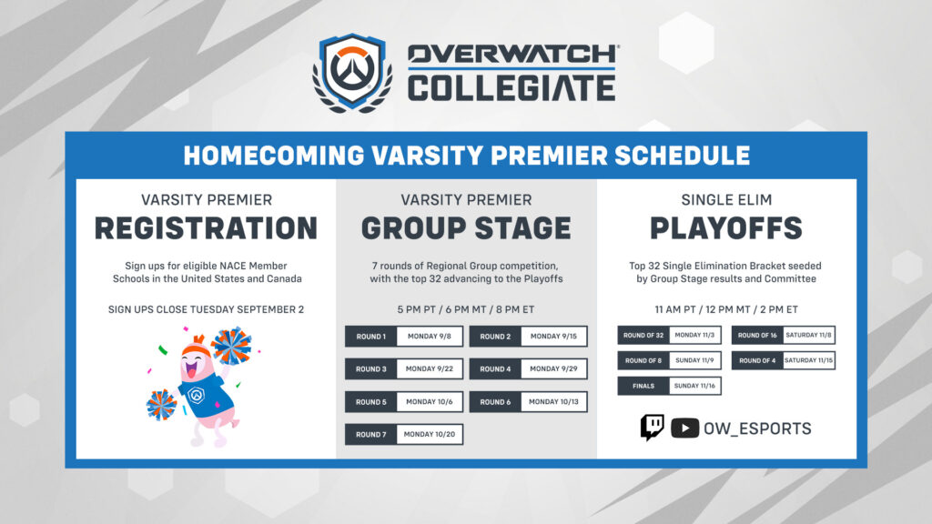 The Overwatch Collegiate program for the 2025 to 2026 calendar involves the Fall Homecoming 2025 season and Spring Championship one. Players can enter the Open and Varsity competitions. The Open is available to eligible institutions in the states and Canada while the Varsity division is available to institutions that are NACE members.