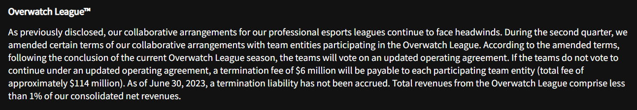 If the teams do not vote to continue under an updated operating agreement, a termination fee of $6 million will be payable to each participating team entity (total fee of approximately $114 million). As of June 30, 2023, a termination liability has not been accrued. Total revenues from the Overwatch League comprise less than 1% of our consolidated net revenues.”