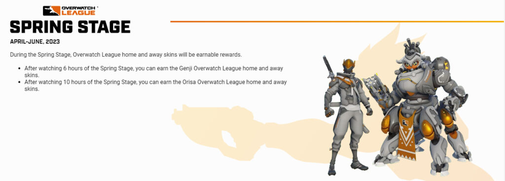 - After watching 10 hours of the Spring Stage, you can earn the Orisa Overwatch League home and away skins.