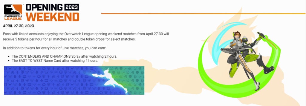 That’s great, but it also seems to allude that tokens will only be available for viewers on those dates. It says nothing about matches past opening weekend. Instead, it offers up rewards for viewing a certain number of hours of OWL.