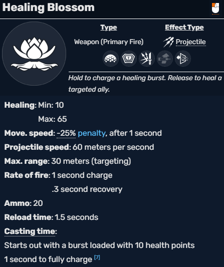 Healing Blossom is Lifeweaver’s left click heal, which can be charged or spammed. A fully charged shot heals 65 health and takes one second to fully charge. Your 20 rounds of ammo can also be spammed out to heal for 10 health a piece.
