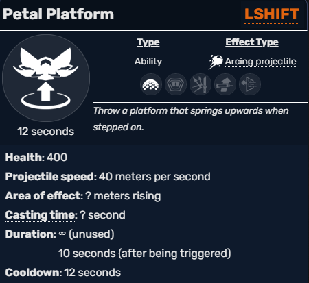 The first of many Lifeweaver abilities that require forthought, Petal Platform triggers a rising platform when stepped on by any player. The platform stays in-air for ten seconds, or until it takes 400 damage. It can also be removed manually by Lifeweaver.