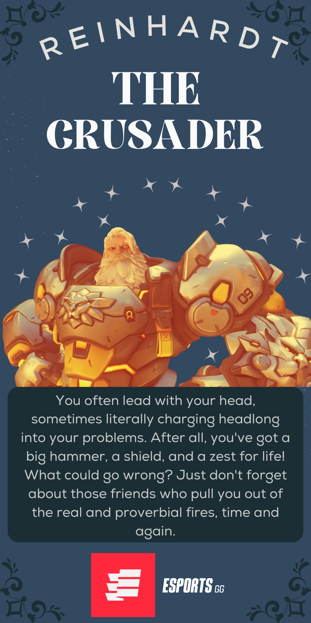 Perhaps the most obvious in our Overwatch personality test. The Crusader is always ready to shit that shift button and dive into the fray. Sometimes this even means doing so at the detriment of those around you. Be mindful of your surroundings, don’t lose vision of the goal, and always remember to turn around when your Supports are screaming bloody murder.