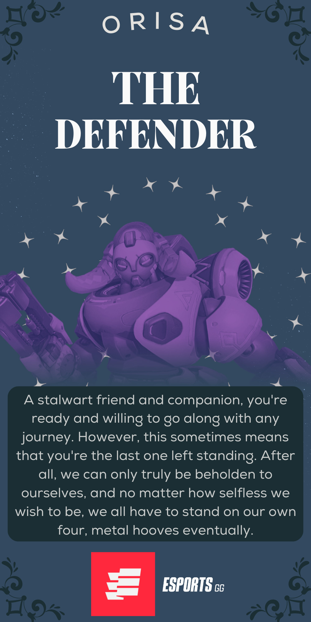 No Overwatch Personality Test would be complete without The Guardian–that one person willing to stand through thick and thin. Even after having your entire kit changed, you still find a way to stand tall, turn around, glow a golden-bronze color, and take the hits that those around you cannot take. However, we all must meet our end eventually, so remember to take the time to find out who you are outside of being that ride or die.