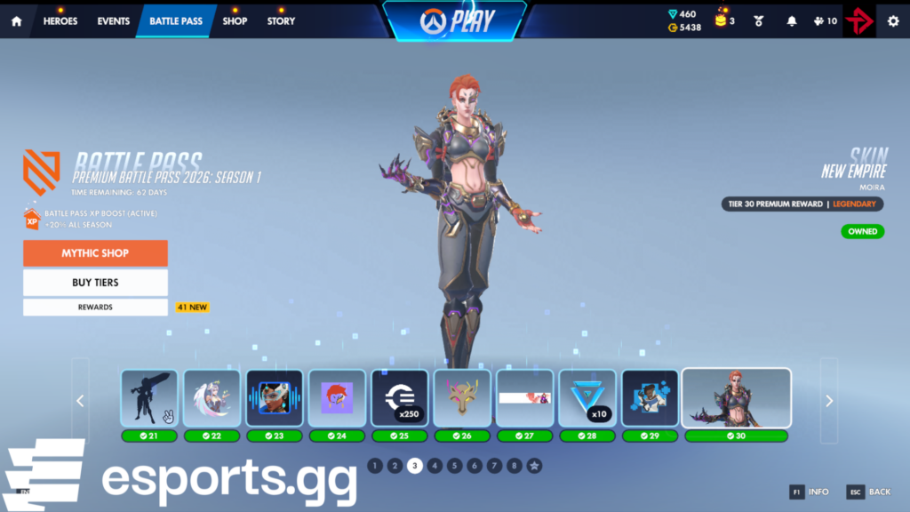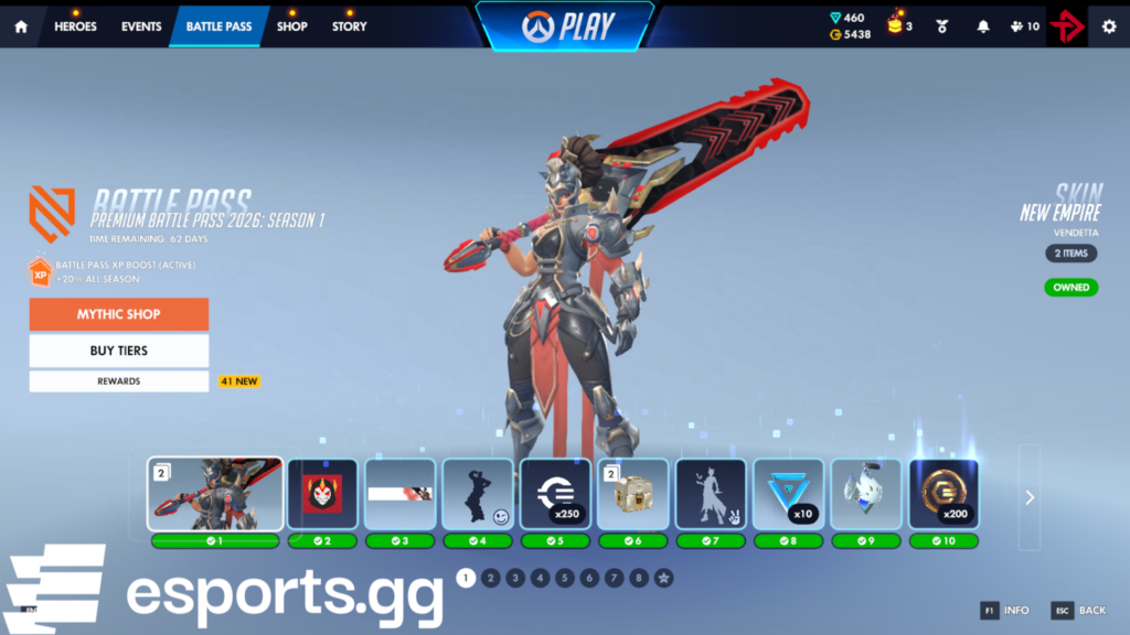 In total, there are eight pages of Overwatch Season 1 Battle Pass items to unlock. After that, the prestige tiers go up to 200. This season’s tier 200 player title is “Empire’s Favored.” You can level up the Battle Pass to reach higher and higher tiers by completing matches for Battle Pass XP. Event challenges grant some extra Battle Pass XP as well.