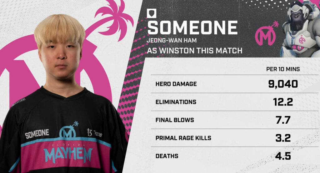 Part of this discord for the Outlaws may have been a fantastic first match of the split by Florida main tank Jeong-Wan ‘Someone’ Ham. Playing multiple tanks and taking advantage of a meta that looks to be splitting from Sombra, Someone bullied the Outlaws DPS. On the back of this performance are team MVP numbers for Someone, including an average of 12 eliminations and 9K damage on map three.